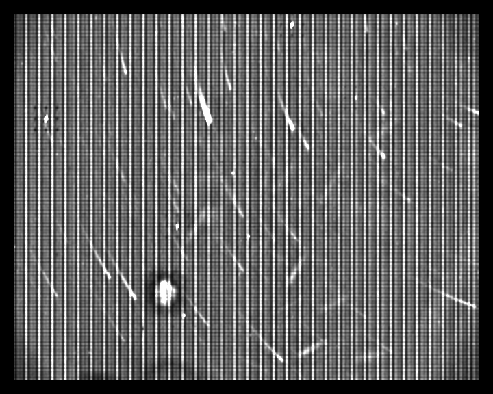 Excluded pixels. This is a map of pixels within the frame which were being ignored owing to too much past variability. They may be foreground objects which are often illuminated by car headlights, for example. Only white pixels are ignored; different shades of grey indicate how much each pixel has varied in the past.